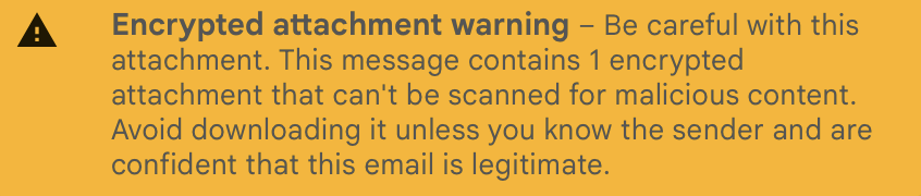 When sending emails with encrypted attachments please be aware that email systems that check for malicious content may display a warning to the recipient that the attachment is encrypted and can’t be scanned. Here is an example of what they may see. These warnings are generated by the receiver’s email system, not from CE.