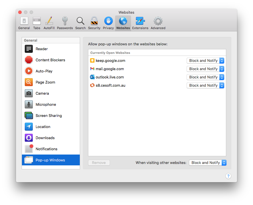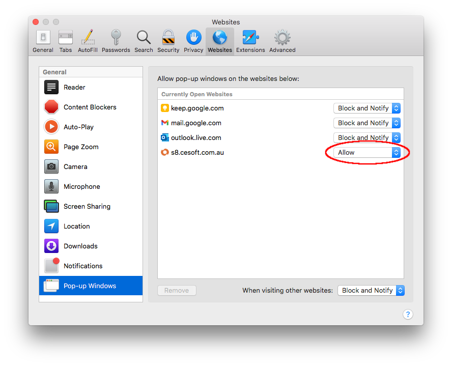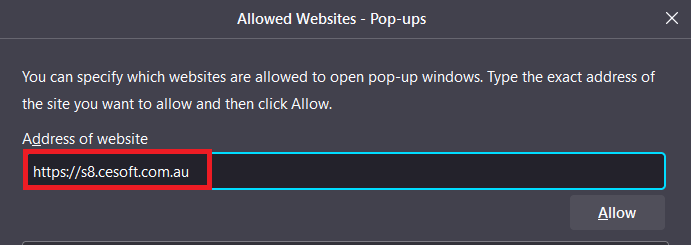 This will list the address s8.cesoft.com.au after you have already visited the site and tried to open a document. In order to allow CE8 to display documents without any intervention, then select Allow.