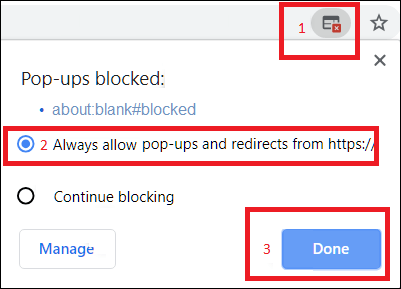 If Chrome is blocking pop-ups, you'll see a symbol in the top right of your screen, on the right end of your address bar in the red square shown above. Simply click the icon and then click "Allow pop-ups on this site".