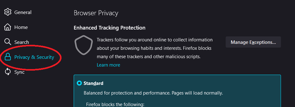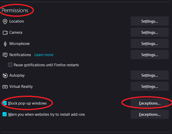 Then, scroll down to "Permissions" and click the "Exceptions" button next to "Block pop-up windows"