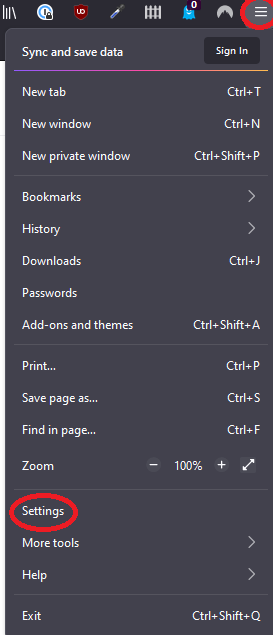 To allow pop-ups on firefox, first click the stacked lines icon in the top right of the browser window and select "Settings" from the drop-down menu