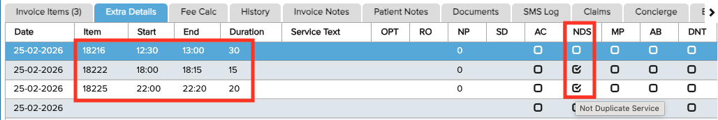You can add these items onto the same invoice as the original epidural, adding the start time on the Extra Details tab. We also recommend ticking the NDS box on the top up items to indicate they are separate services.
